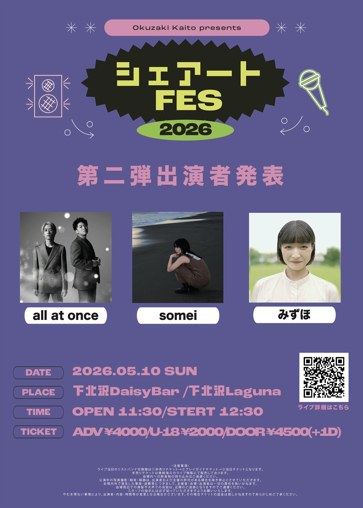 2026年5月10日(日)に下北沢DaisyBar / 下北沢Lagunaで開催される奥崎海斗 presents「シェアートFES 2026」の第二弾出演者が決定しました。