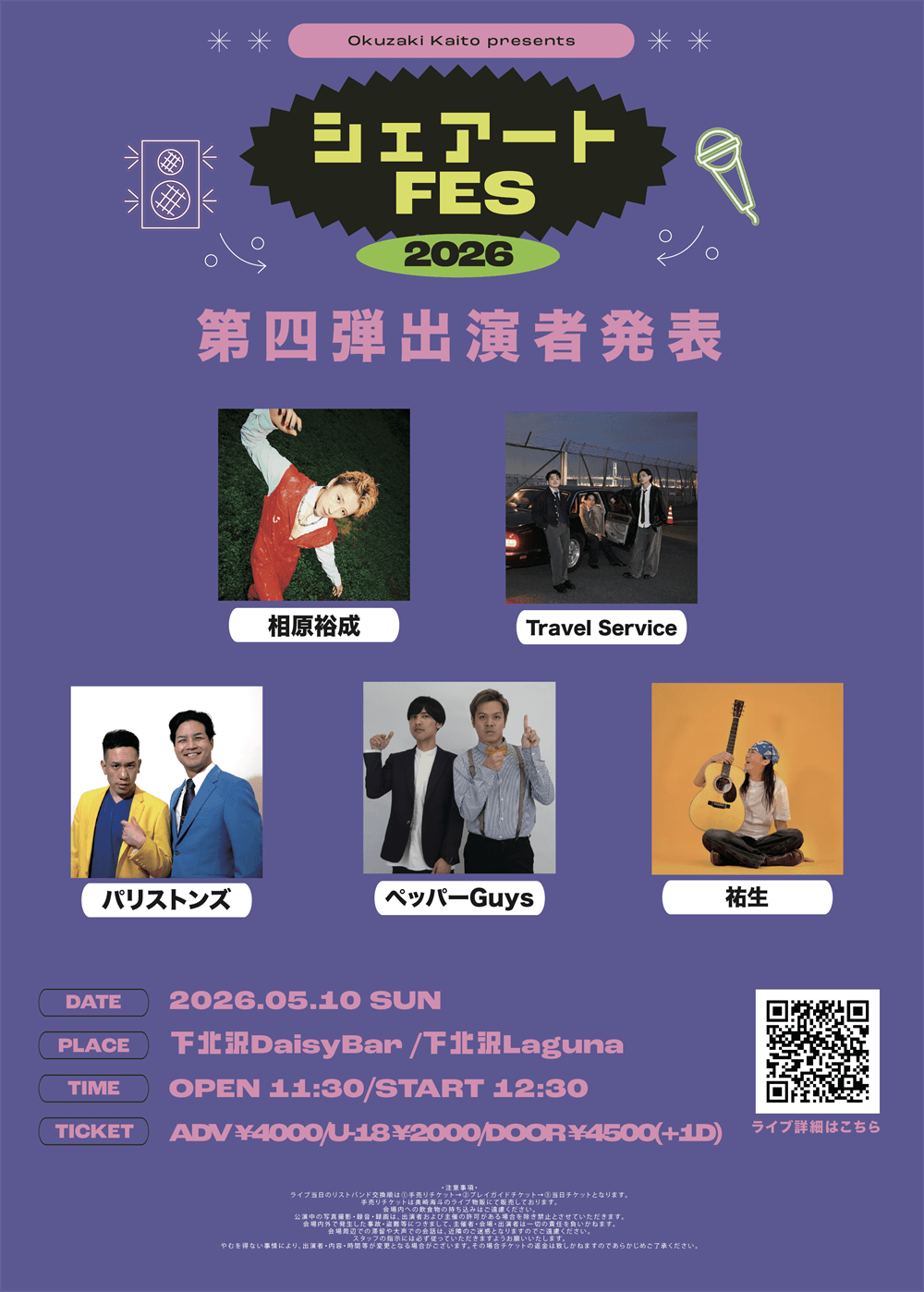 2026年5月10日(日)に下北沢DaisyBar / 下北沢Lagunaで開催される奥崎海斗 presents「シェアートFES 2026」の第四弾出演者が決定しました。