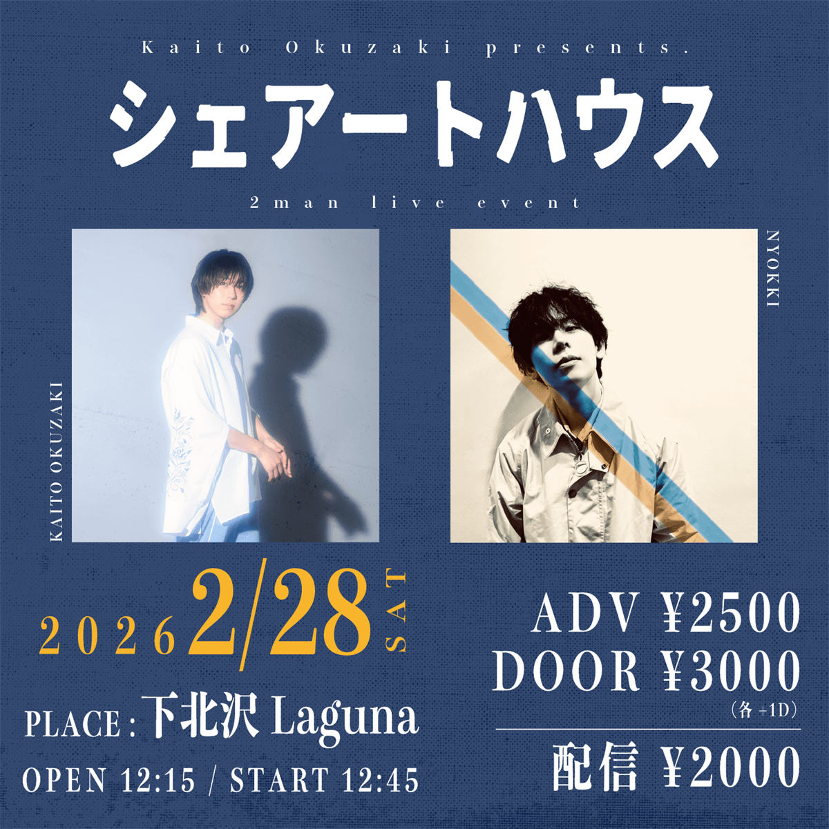 2026年2月28日(土)に下北沢Lagunaにて奥崎海斗 2man live event「シェアートハウス」の開催が決定いたしました!